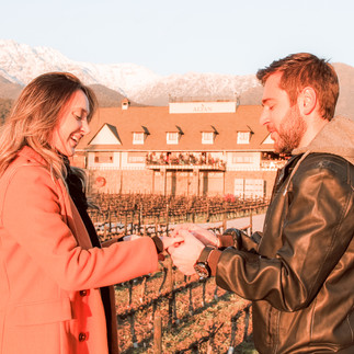 Taís e Leonardo (fotos acima) foram fotografados em agosto, por isso conseguimos ver bastante neve na pontinha da cordilheira. Durante os pedidos de casamento, nos afastamos um pouco do grupo de turistas e vamos para um espaço mais reservado, onde podemos ter maior privacidade. Durante o tour, o pedido é feito na hora do pôr do sol, durante a degustação do vinho Naranjo.